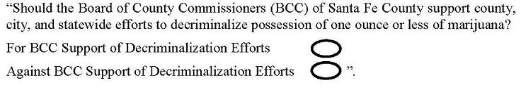 Santa Fe, NM – September 9, 2014 – The Santa Fe Board of County Commissioners unanimously approved Resolution 2014-87, a Resolution proposing a countywide advisory question for the 2014 General Election concerning public support for efforts to decriminalize possession of one ounce or less of marijuana.