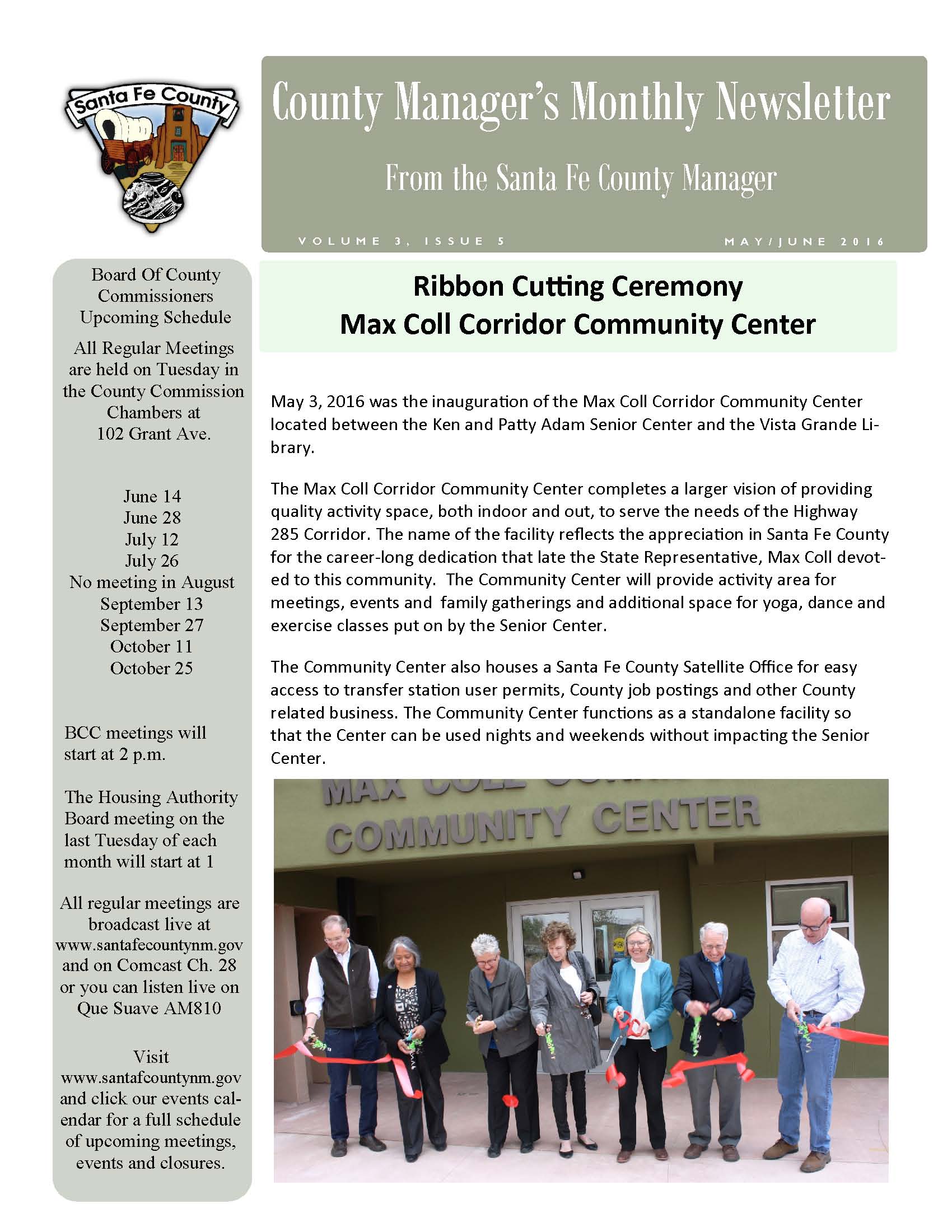 Please look for the newsletter to hit your email around the middle of each month, instead of the end of the month (during this transition May and June were combine into one newsletter). Click on the image to view the May / June 2016 newsletter or visit http://www.santafecountynm.gov/county_manager.