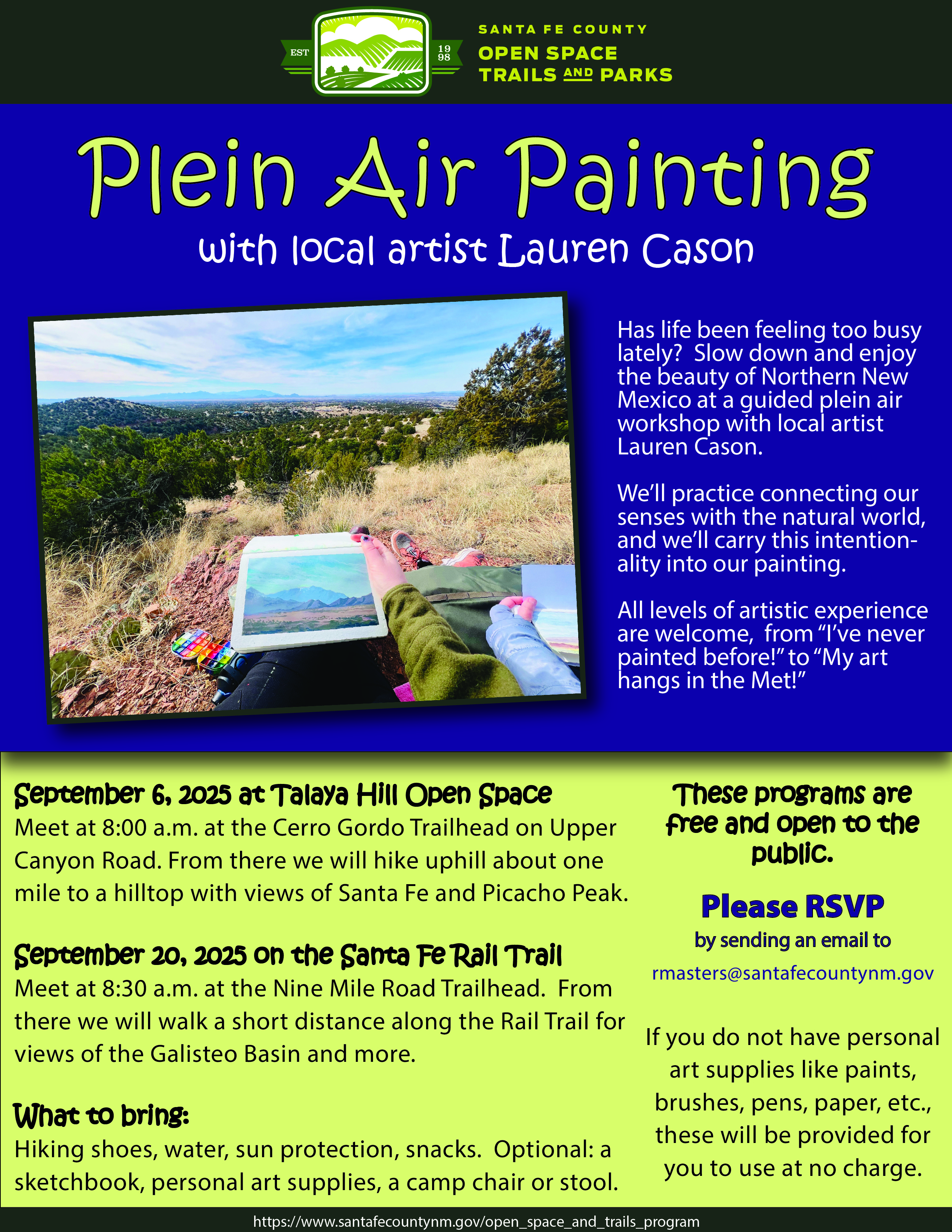 Plein Air Painting Programs, September 2025 Saturday, September 6, 2025, 8:00 a.m., Talaya Hill Open Space Meet at 8:00 a.m. at the Cerro Gordo Trailhead on Upper Canyon Road. From there we will hike uphill about one mile to a hilltop with views of Santa Fe and Picacho Peak. Saturday, September 20, 2025, 8:30 a.m., Santa Fe Rail Trail Meet at 8:30 a.m. at the Nine Mile Road Trailhead. From there we will walk a short distance along the Rail Trail for views of the Galisteo Basin and more. What to Bring: Hiking shoes, water, sun protection, snacks. Optional: a sketchbook, personal art supplies, a camp chair or stool. If you do not have personal art supplies like paints, brushes, pens, paper, etc., these will be provided for you to use at no charge. These programs are free and open to the public. Please RSVP by sending an email to rmasters@santafecountynm.gov. |