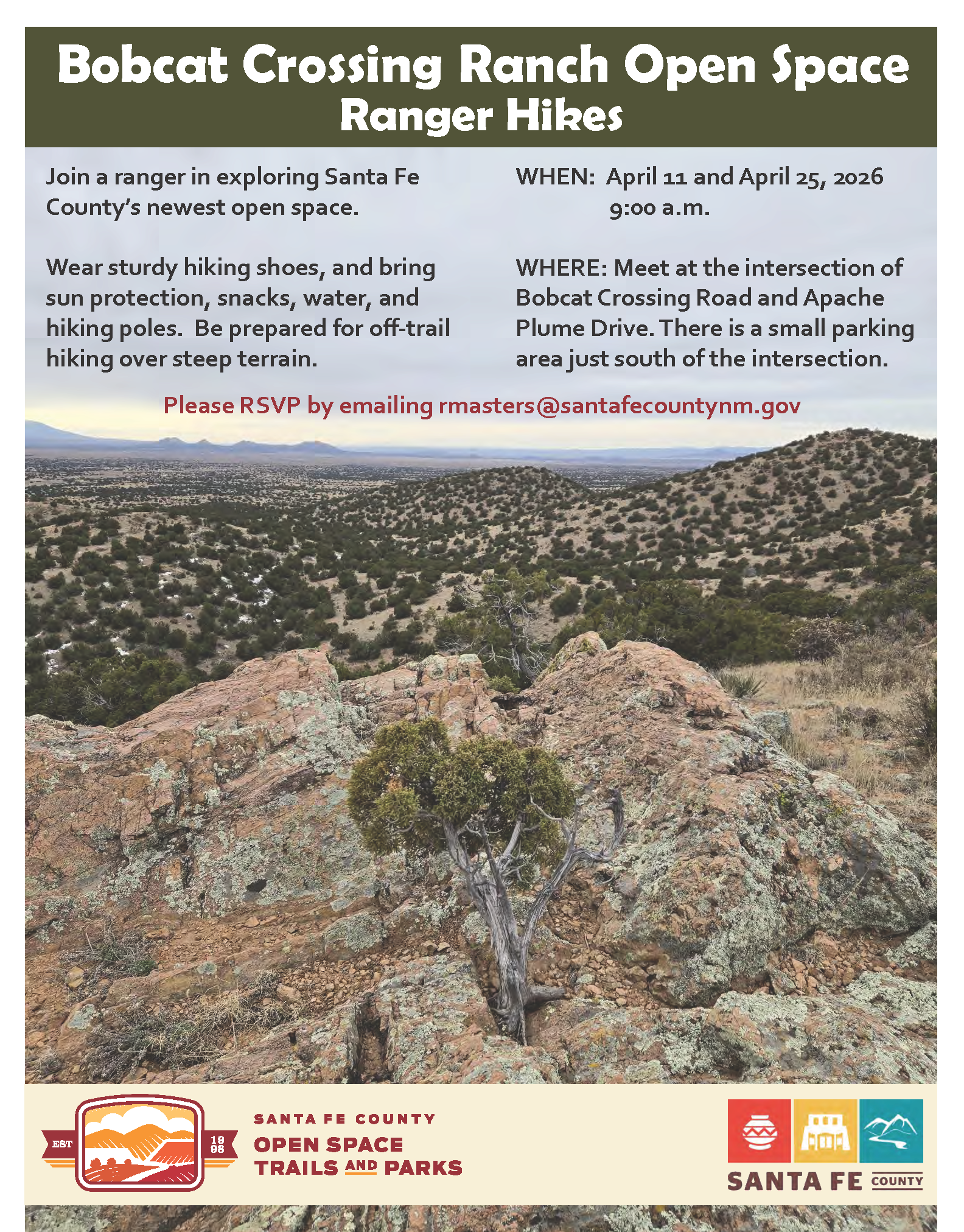 Join a ranger in exploring Santa Fe County's newest open space. Hikes will take place on April 11th and April 25th. Meet at 9:00am at the small parking area near the intersection of Bobcat Crossing Road and Apache Plume Drive. Please wear sturdy hiking shoes, and bring sun protection, snacks, water, and hiking poles. Be prepared for off-trail hiking over steep terrain. RSVP by sending an email to rmasters@santafecountynm.gov. |